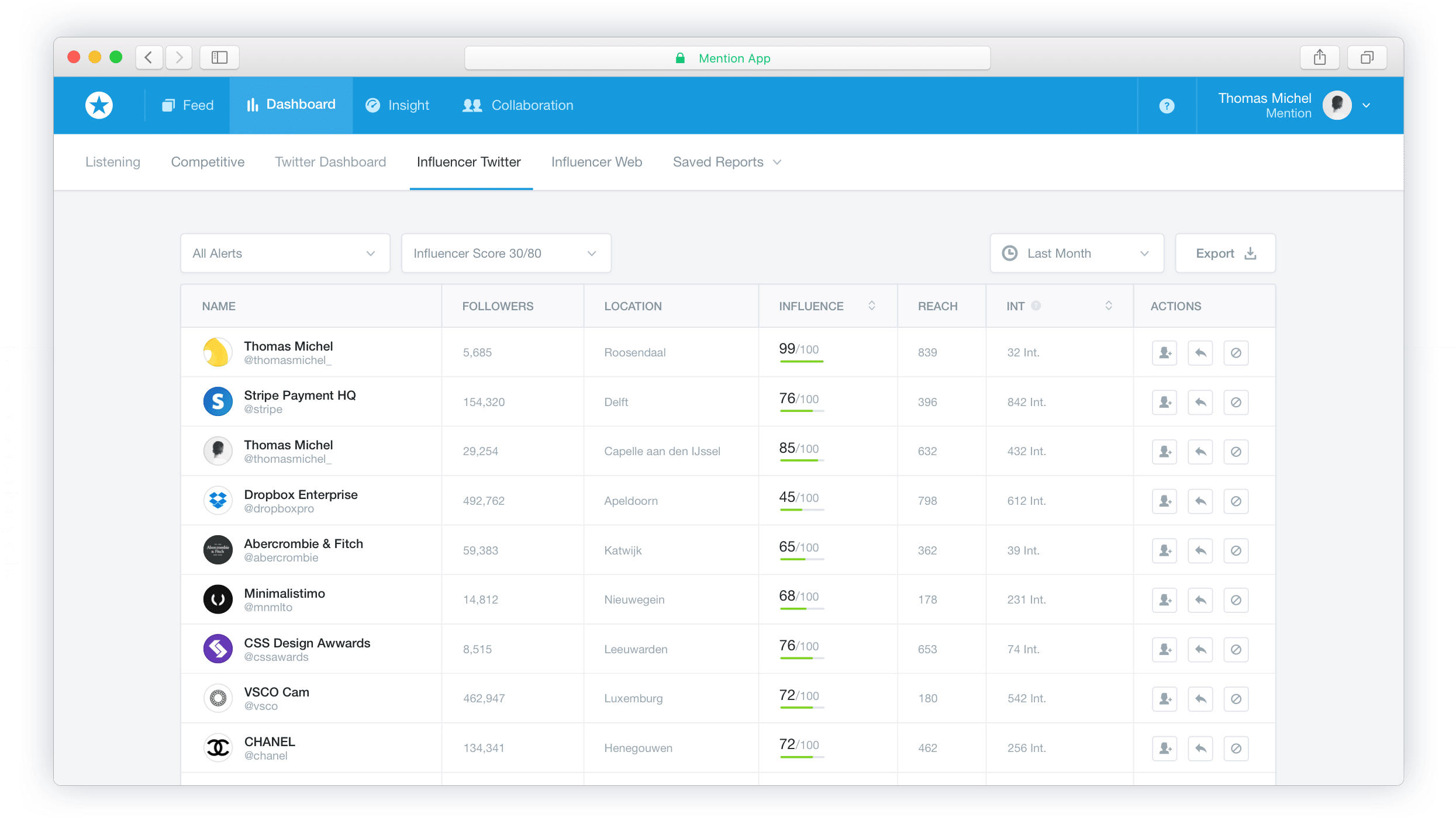 Set up a brand alert in your Mention account and the influencers dashboard will rank your current advocates by influence. Create an alert on industry keywords and you will discover your field’s influencers.